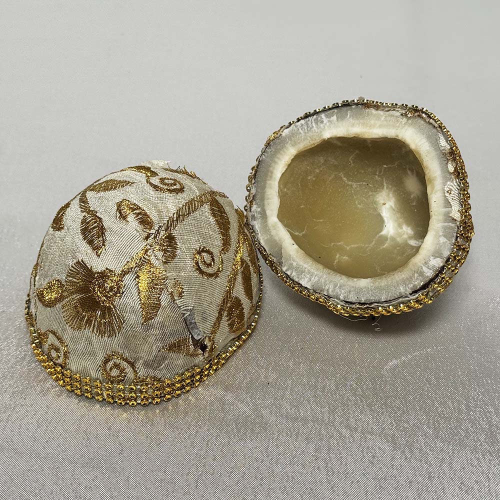 Two real half coconuts that have been beautifully decorated with an ivory material with gold embroidery and gold lace. These tootia are perfect to pack with dried fruit and presented during the ceremony of the ladies milni.