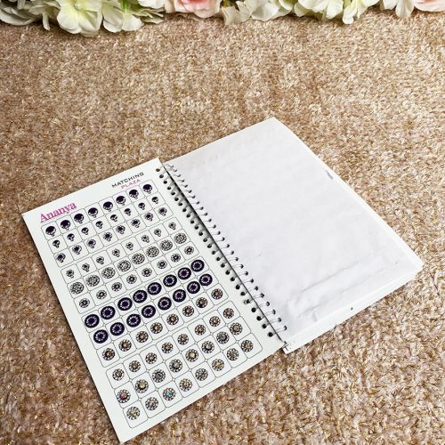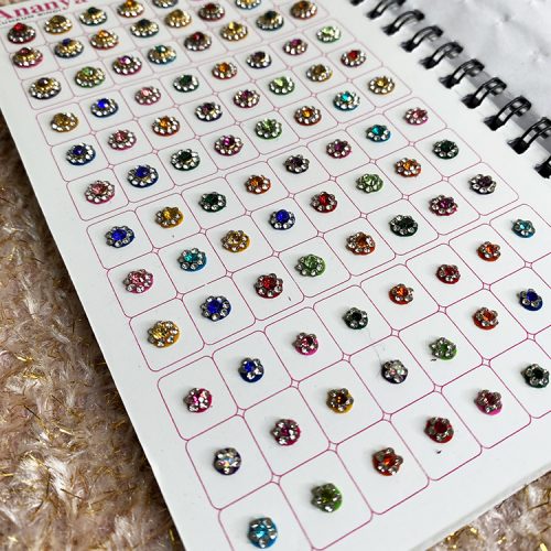 These lovely high quality diamanté’s decorated style bindis are available in a range of different colours and sizes. This bindi book has 960 bindis.