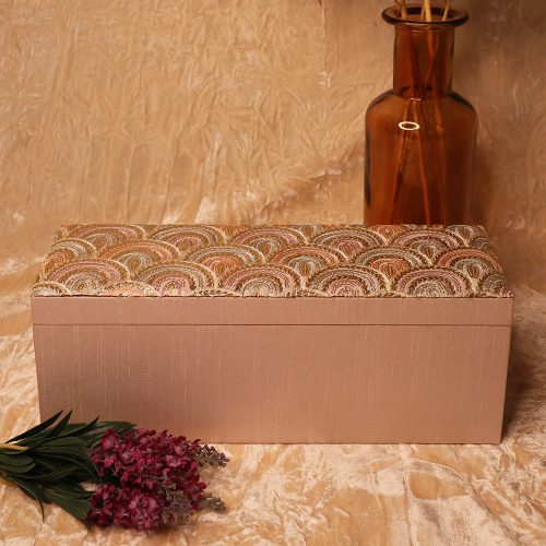 Our brand new choora boxes have arrived! This gold design choora box has been fabricated with a dupin silk fabric finished with a handpicked material on the lid of the choora box to provide an elegant contrast.