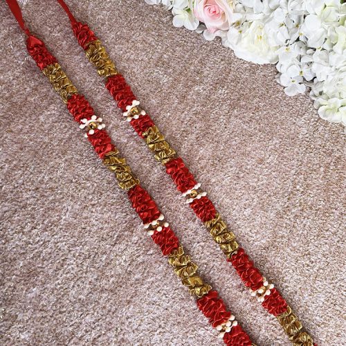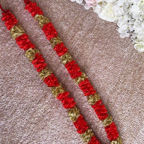 Beautiful wedding Haar made with soft fabrics and gold beads, the haar also has small pearls in the middle of the rose designs. This wedding Haar is normally used whilst the Milni ceremonies are taking place.