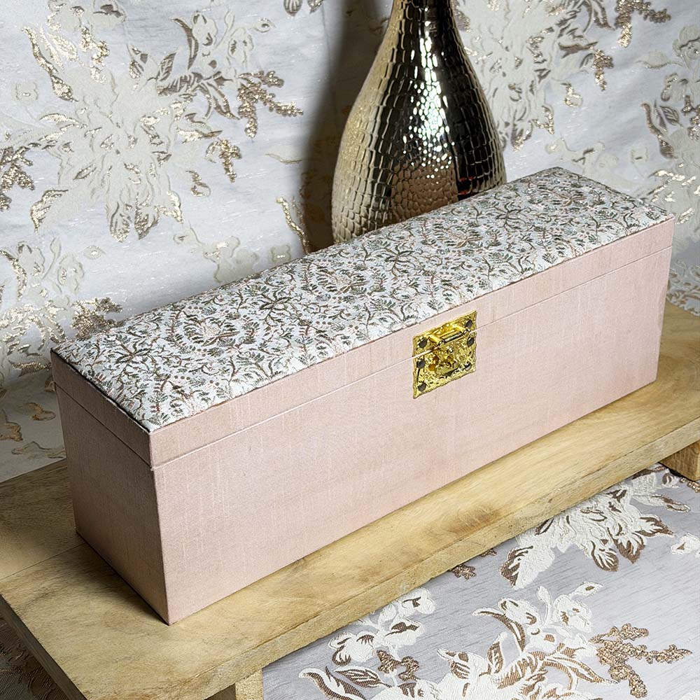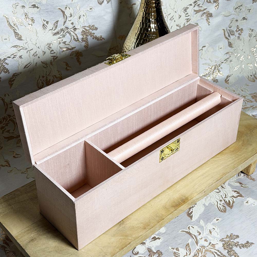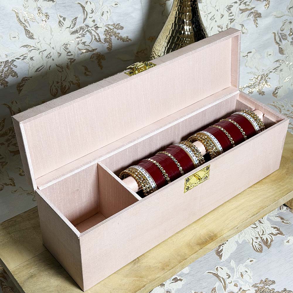 Giving elegance a new look… Our new pastel pink choora and kalira box shows off a unique fabric design on the lid which contrasts perfectly with the pastel pink fabric used to fabricate the bottom of the box. Inside allows you to place your wedding choora and kalira.