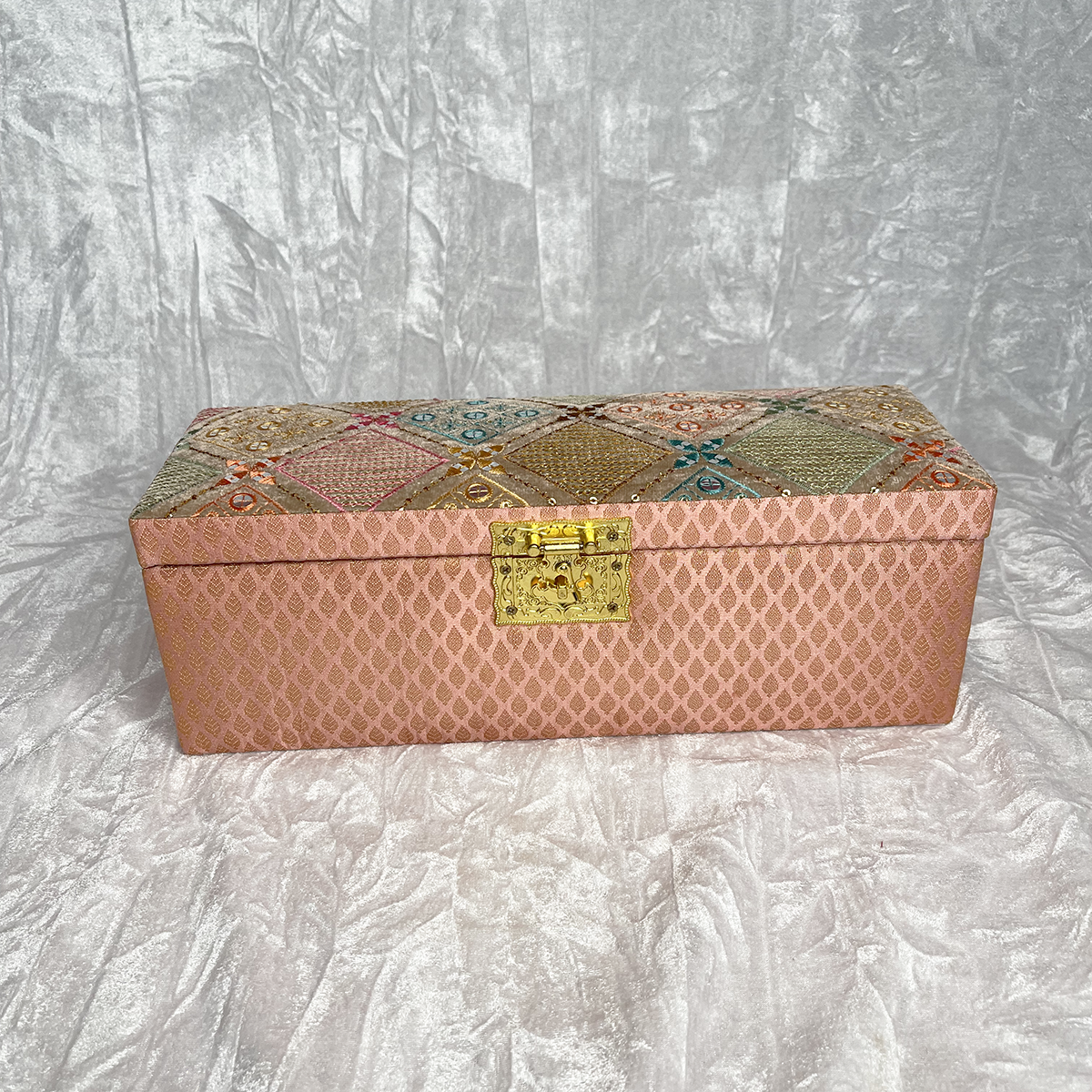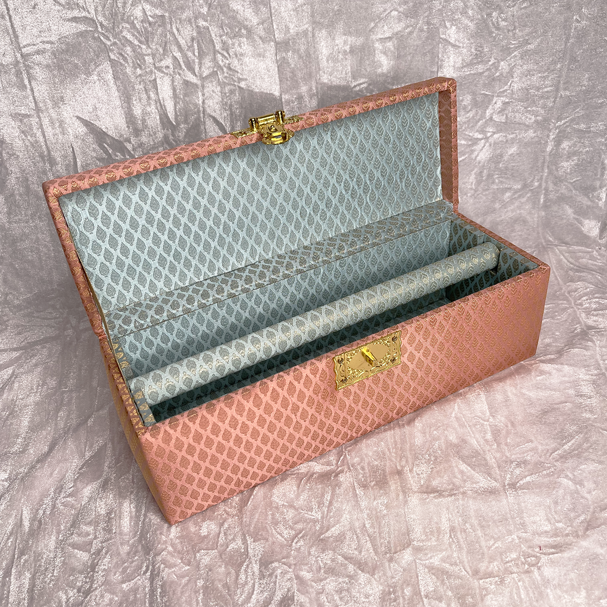 These beautiful hand made choora boxes have been so elegantly crafted by our artisans. This box has been finished with a beautiful velvet and sequence patterned material on the top, the box has also been given extra padding all round with give an even more plush feel to the Choora box. This box is a stunning keepsake for your bridal choora and will also look amazing in wedding photos and gift hampers.