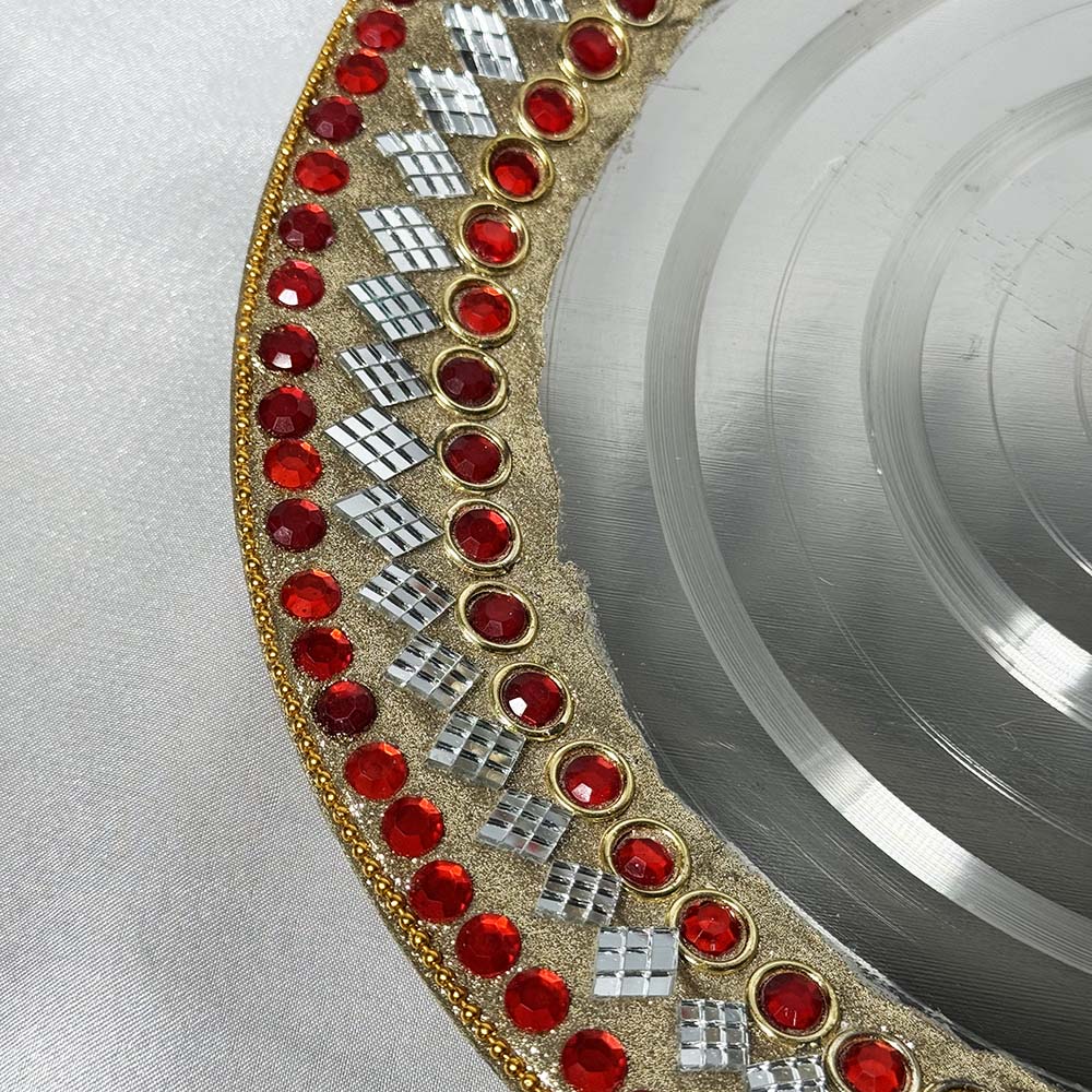 This beautiful thali has been decorated around the border with red stones, diamond shaped mirrors and a gold glitter. This thali can be used for many wedding ceremonies leading up to the big day.