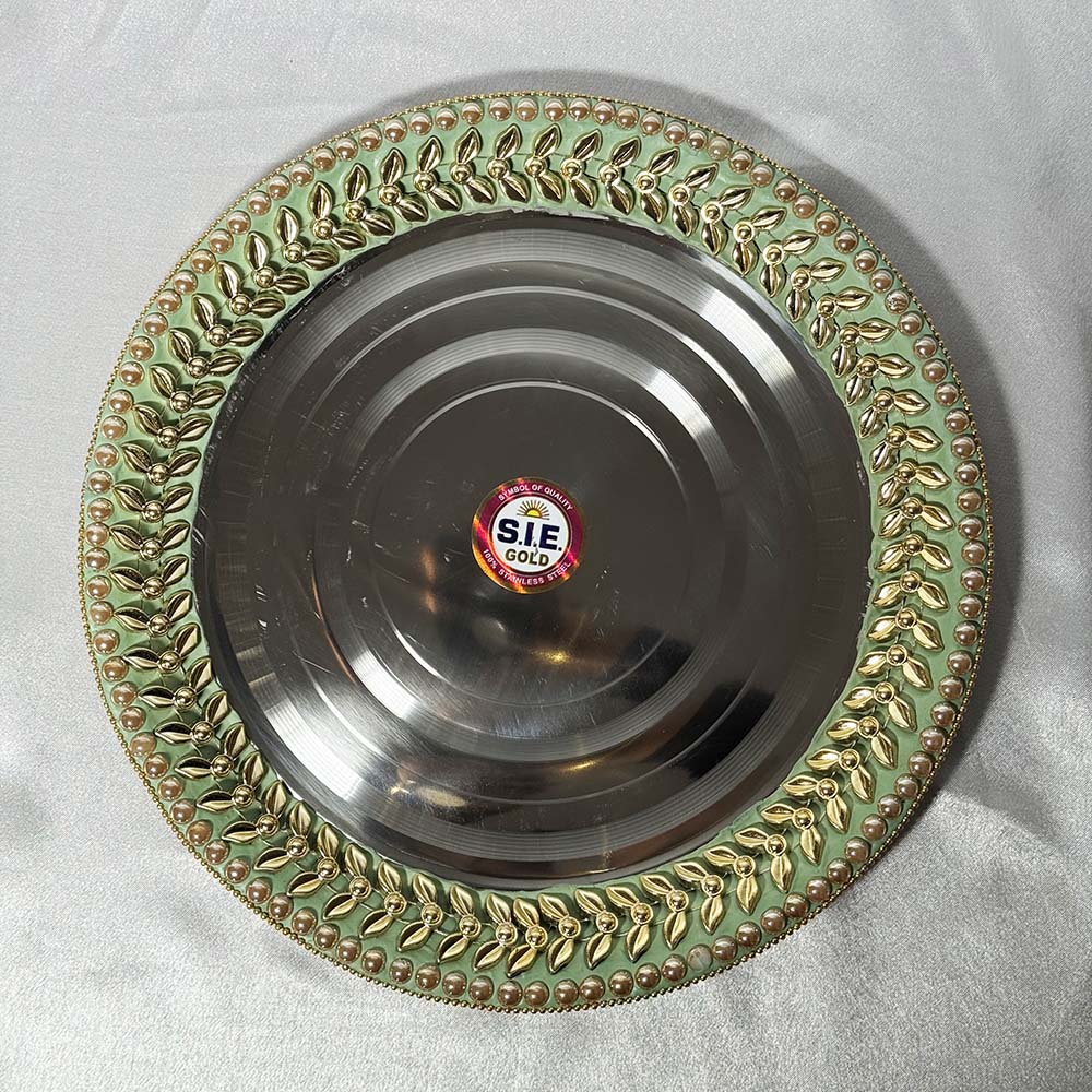 Sage Green and Gold Border Decorated Thali – 11.5″ Size