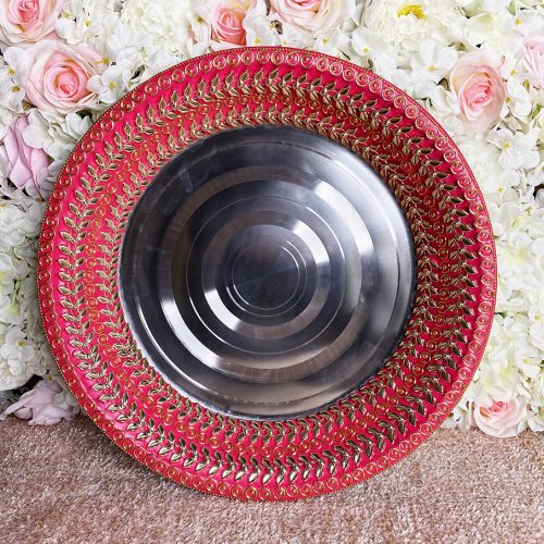 This praat has been beautifully decorated with a glitter sage green colour running along the border, on top of this sits gold beads, rings and a lace design to uplift the praat. Made from stainless steel this praat will look amazing in during the choora ceremony.