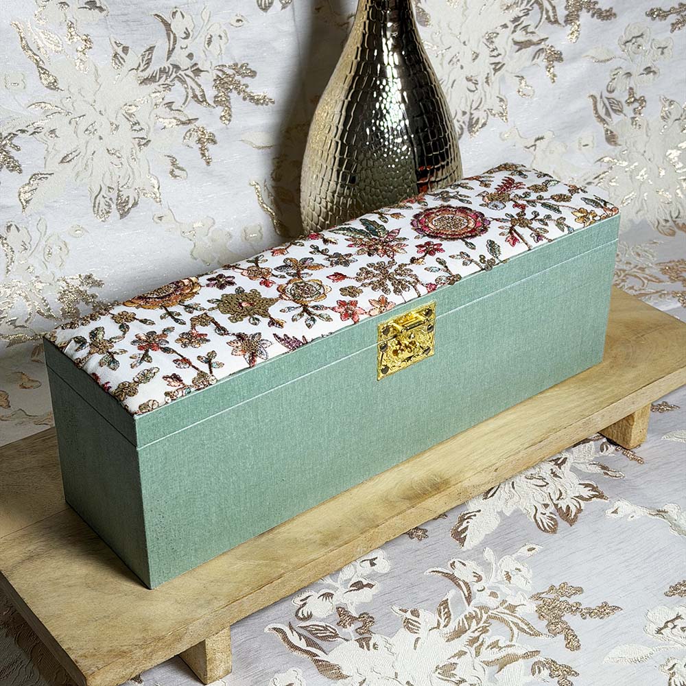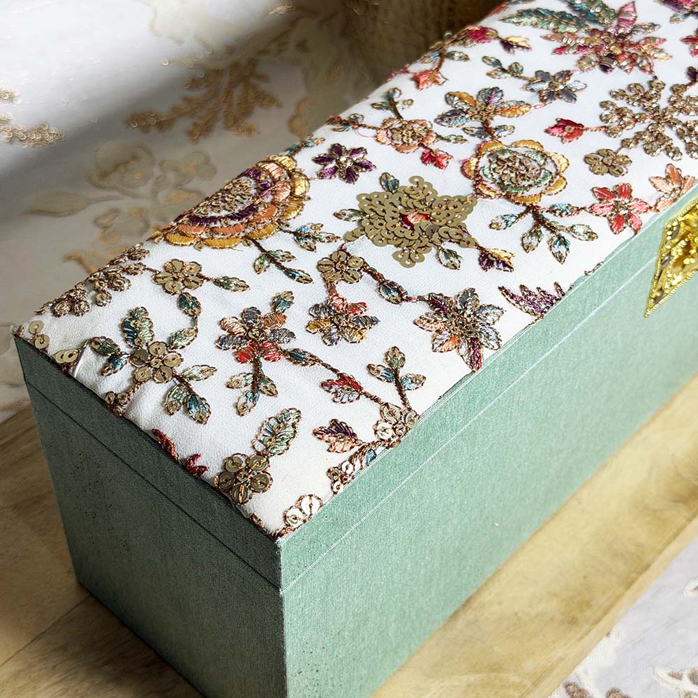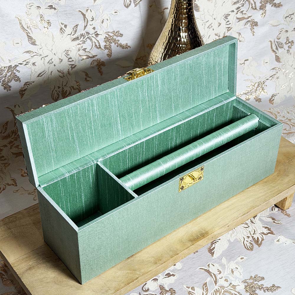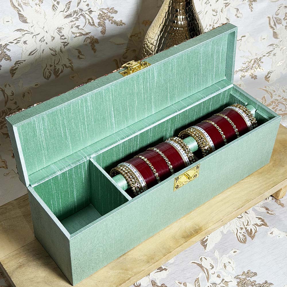 Giving elegance a new look… Our new sage green choora and kalira box shows off a unique fabric design on the lid which contrasts perfectly with the pastel green fabric used to fabricate the bottom of the box. Inside allows you to place your wedding choora and kalira.