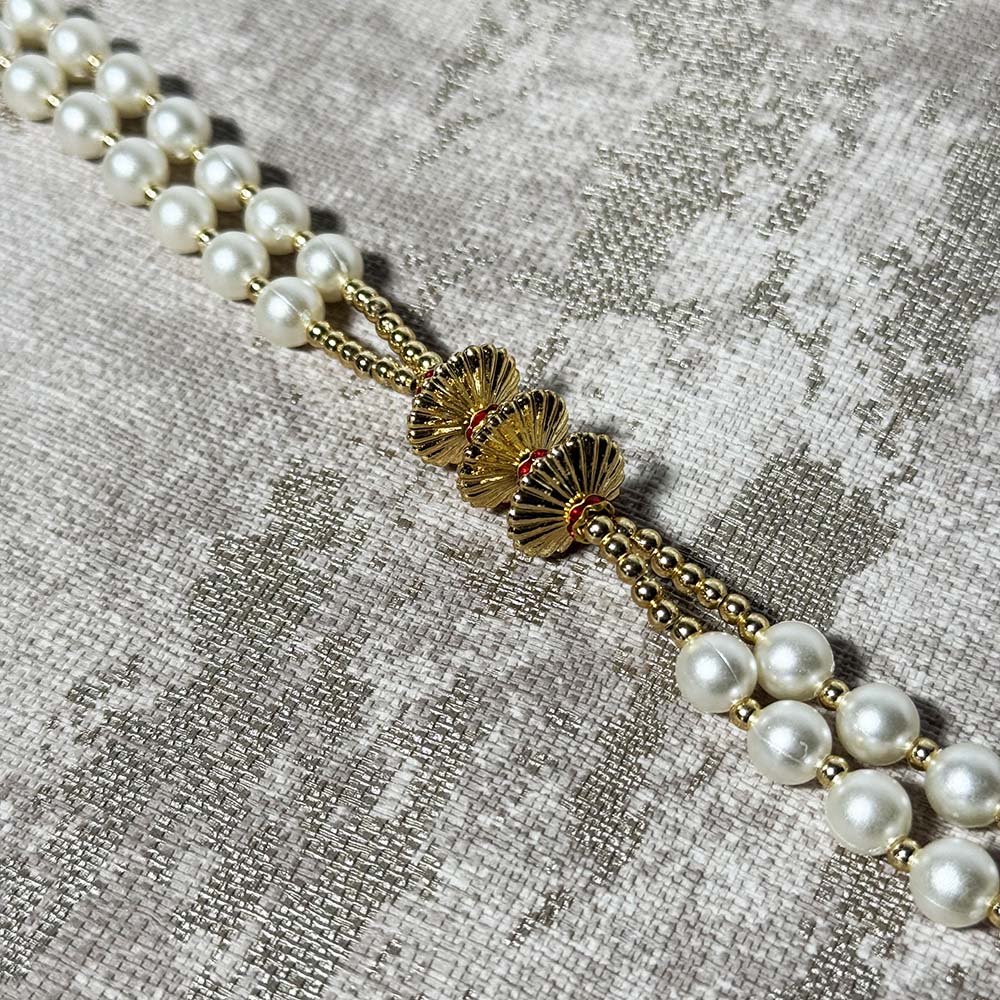 Greet your new extended family members with respect and elegance with our pearl design Milni Haars. This two row pearl design haar has gold chakri shaped beads running in sections to add a unique look.